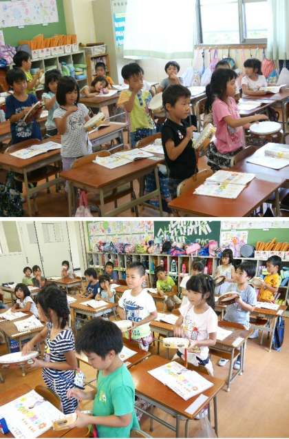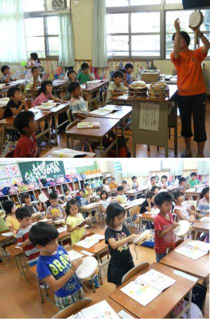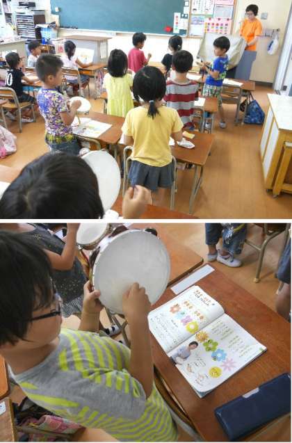 1年生がタンバリンを使って、リズムをうつ練習をしていました。「ぶん ぶん ぶん」を先生の伴奏にあわせて元気よく練習していました。