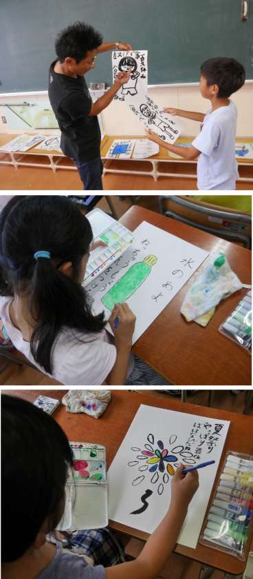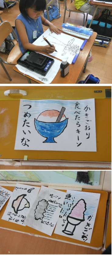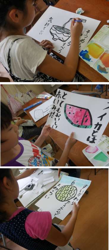 4年生が図工で夏をモチーフにした絵を描いていました。絵手紙風に墨で輪郭をかき、うすめた絵具で色をつけています。夏らしい作品ができあがりました。文章が楽しいですね。