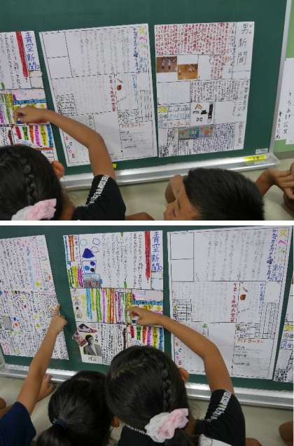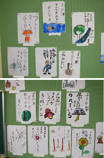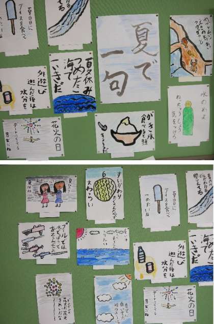 4年生の教室に出来上がった「夏で一句」の作品がはられました。皆で作った新聞も掲示されています。