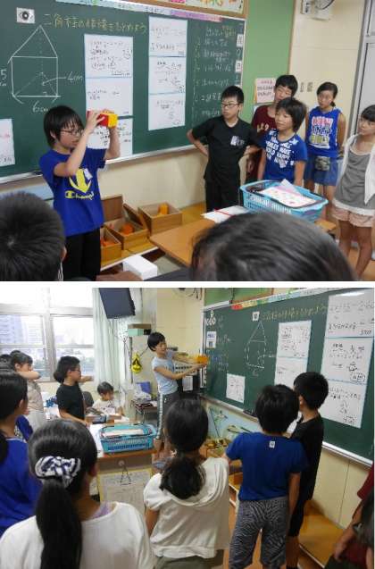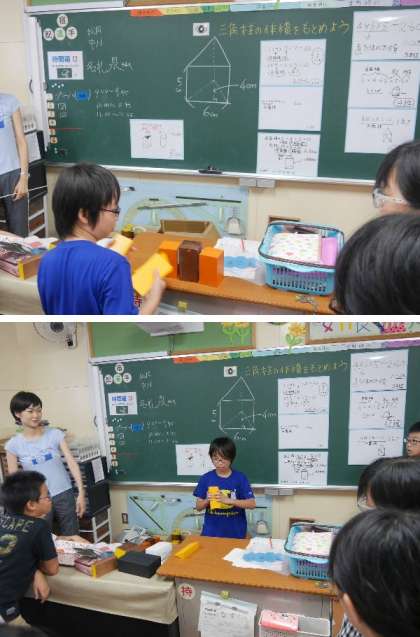 今日は土曜授業ですが、午前3時間を通常どおりに授業をしました。6年生の算数で「三角柱の体積を求めよう」ということで、ホワイトボードで班で考えた計算式が並びました。立体模型をつかって説明しているところですね。