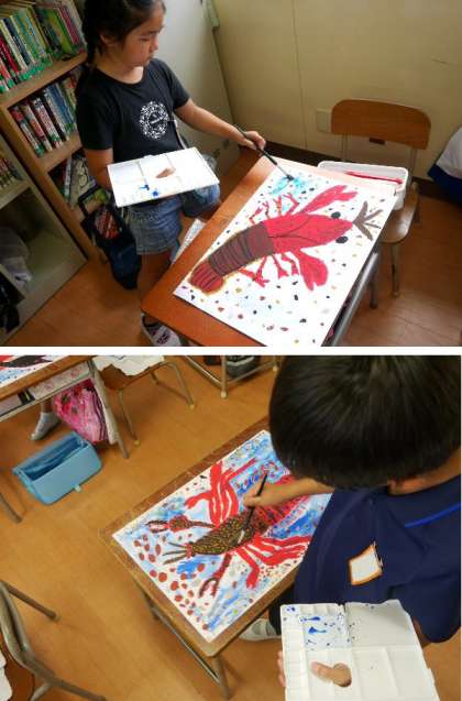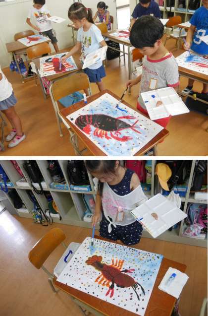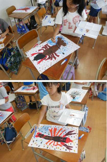 2年生では班で飼育しているザリガニの絵を描いています。クレパスでしっかり書き込んだザリガニの背景に薄い水色を絵具で塗って完成させました。よくできていますね。