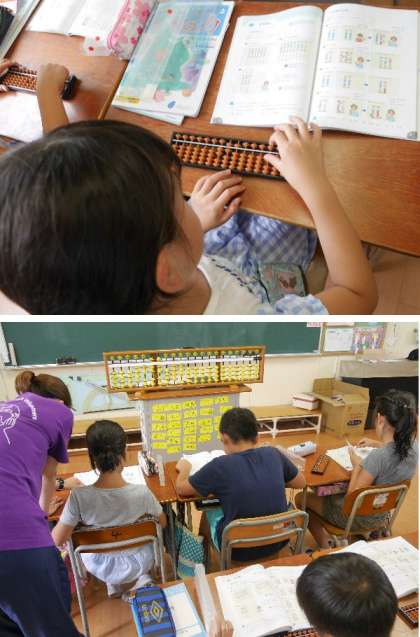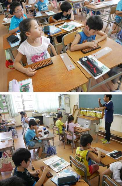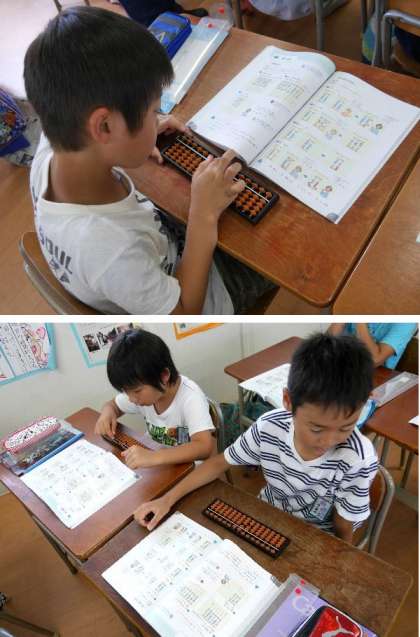 4年生の算数では、そろばんを使って計算できるように練習していました。計算をするしくみがよくわかると思います。うまく指が動くかな?