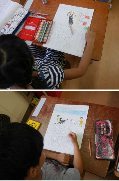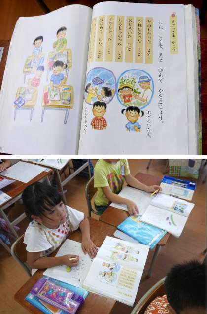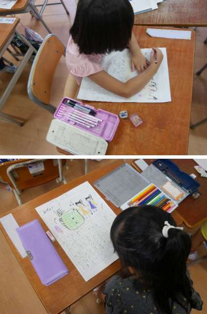 1年生で絵日記をかく練習をしています。もうすぐ夏休みです。夏休みの思い出を絵日記にしてみてくださいね。