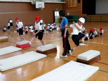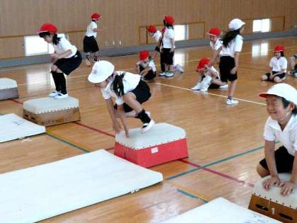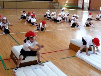 1年生の体育では、マットからとびばこの練習にはいりました。とびばこを一段だけマットにつけて、とびばこに乗ってとんだり、座ったりとすこしずつ慣れているところです。先生の見本をしっかりとみて段階をおって運動します。さまになってきているでしょう。