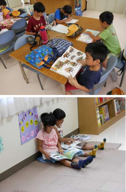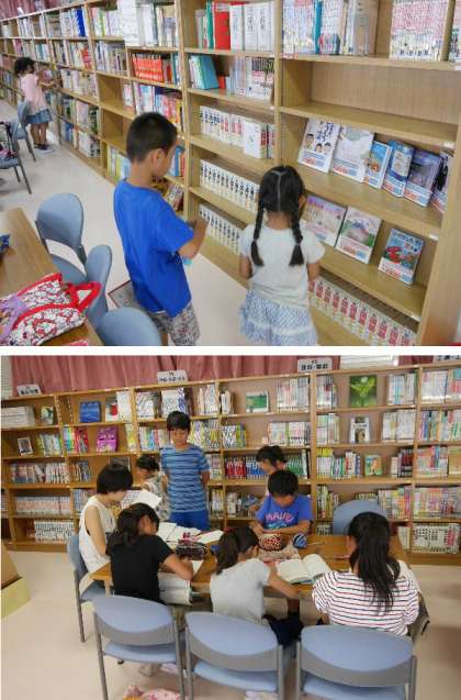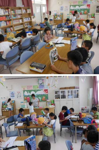 プール開放にあわせて図書室の開放もされています。プール開放を待っていたり、宿題をしたり勉強をしている子もいます。