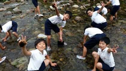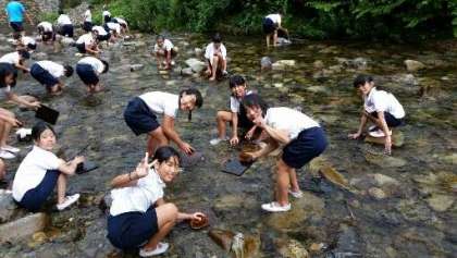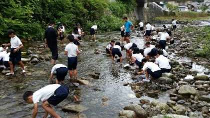 避難訓練のあと宿舎の裏の川で焼き板みがきをしました。雨が急に降ってきました。