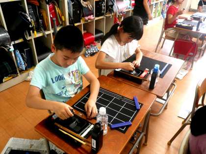 3年生がはじめて習字道具を使った練習をしました。習字箱のひとつひとつの使い方を学習し、筆のおろしかた、墨のすり方、筆をつかって書くことをしました。
