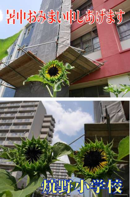 学校ではエアコンの工事もほとんど終わりになってきました。ひまわりも大きな花を咲かせようとしています。