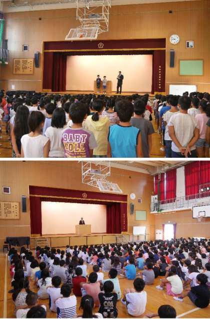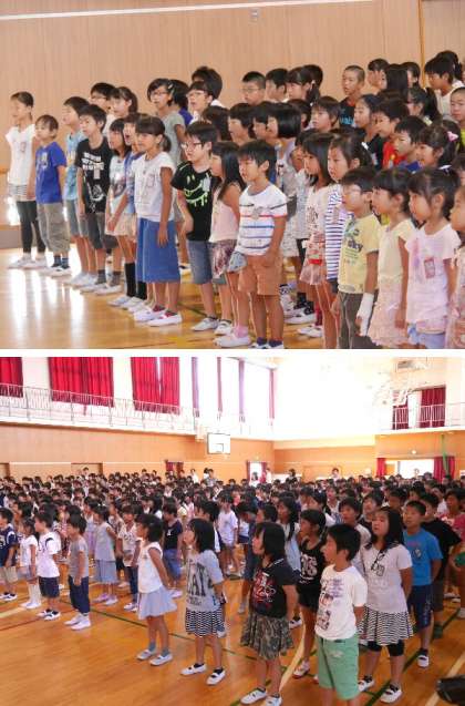 今日から2学期です。講堂で始業式をおこないました。今日から新しく来たお友だちを皆さんに紹介しました。校長先生からは早く学校のある生活リズムを整えて、運動会などの行事に元気よく取り組んでくださいとお話しました。また、今日は防災の日なので、関東大震災のお話もしました。最後に、久しぶりに全員で焼野小の校歌を歌いました。
