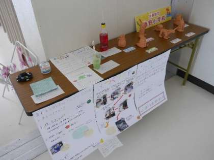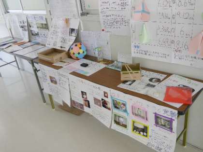 夏休みの自由研究の宿題が教室前に並べられています。いろいろなことに興味をもってとりくんでいます。見応えのあるものになっていますね。