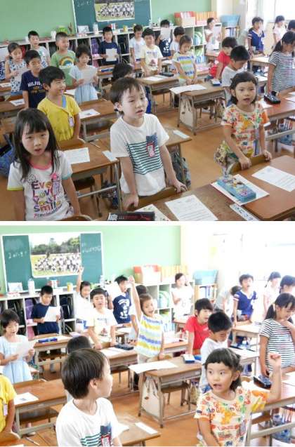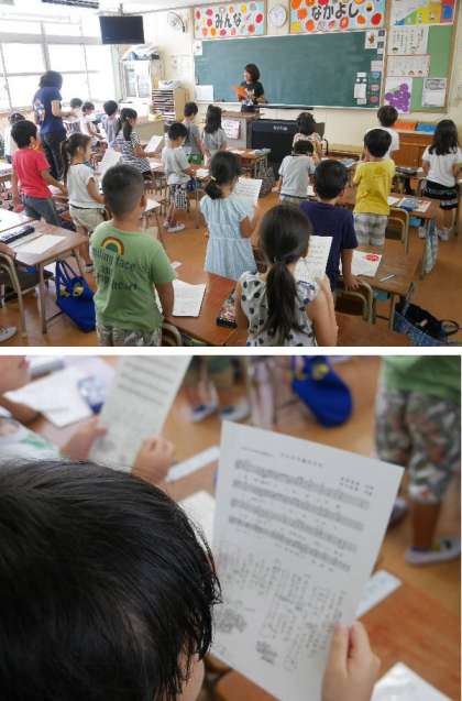1年生は初めての運動会ですね。運動会で歌う歌を練習しています。「ふれふれ赤組!ふれふれ白組」しっかり大きな声で歌いましょう。