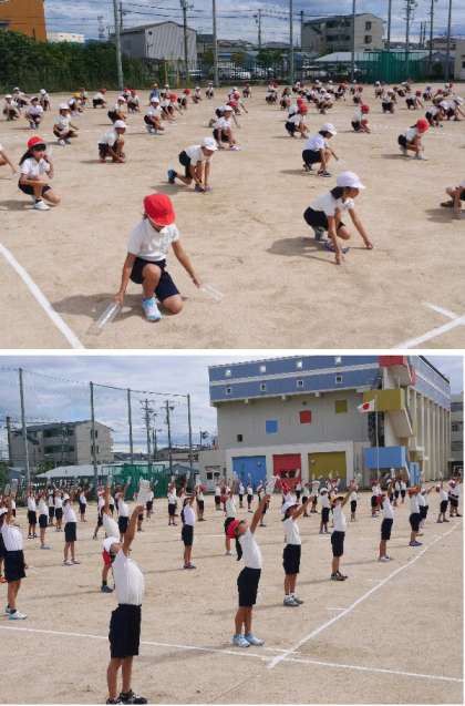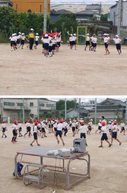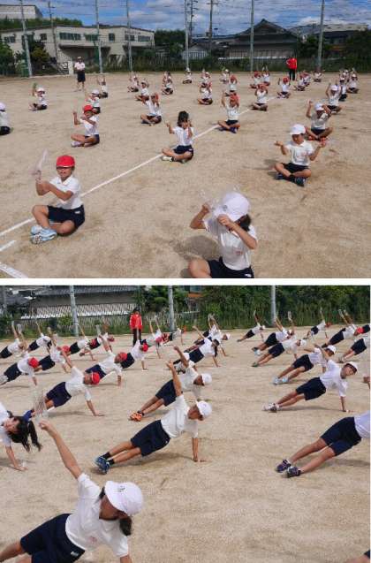 3・4年生は午後から雨もあがったので運動場で練習です。実際の場所での位置をきめるのが難しいですね。