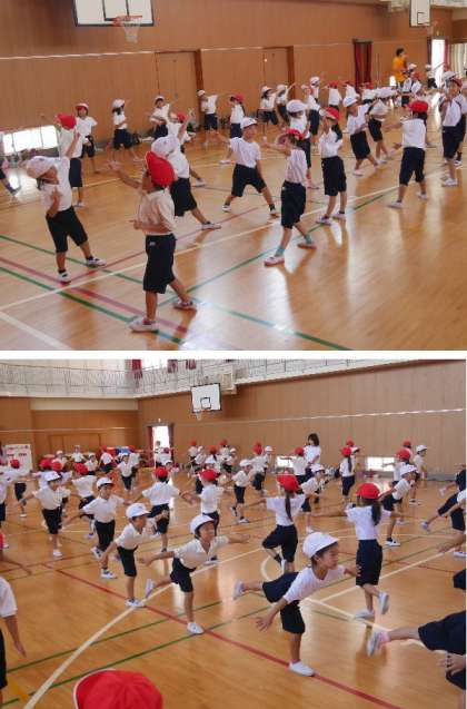 1・2生の練習です。「ボルトのポーズ」と声がかかりました。あの金メダリストをイメージしてポーズをします。かっこよくきまってきましたよ。