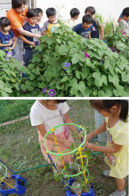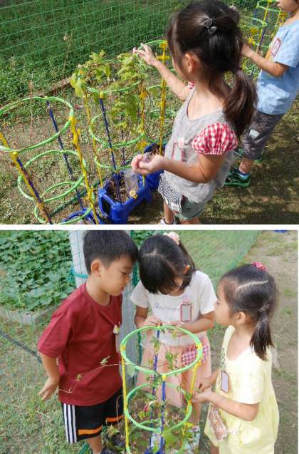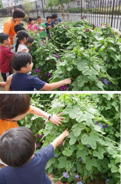 1年生では1学期にアサガオを育ててきました。夏休みにはいったん家に持ち帰り、2学期に学校にもってきてもらっています。花が終わって種ができています。学習園ではまだアサガオが咲いていますが、種ができているのもありました。