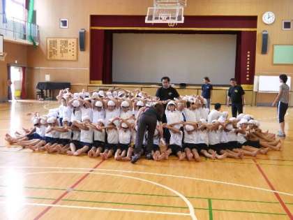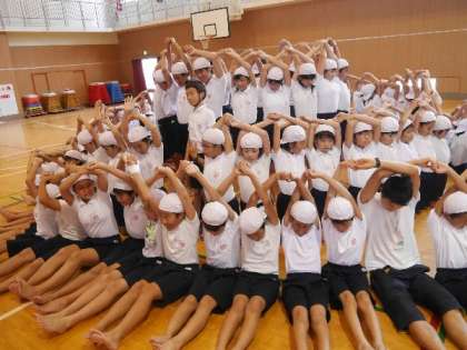 5・6年生が輪になってつながって演技しています。なかなか難しいですね。先生も子どもたちに見本をみせています。