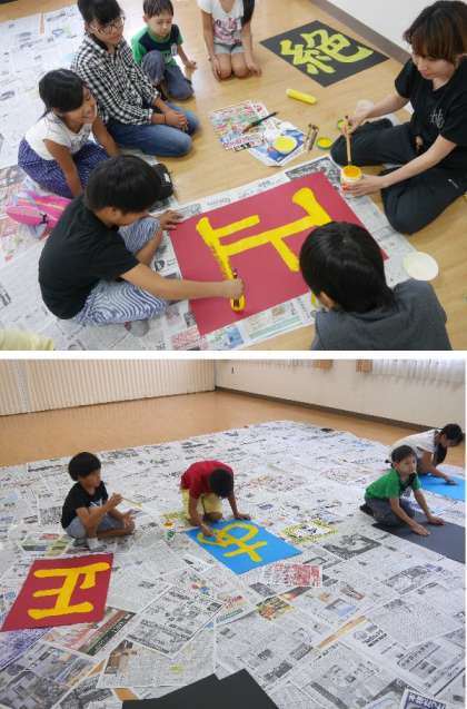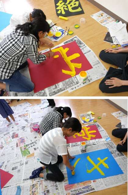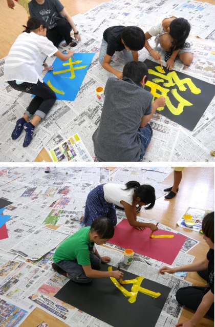 委員会活動で、運営委員は運動場に掲示する運動会のめあてを作っていました。大きな筆で一文字一文字書いています。