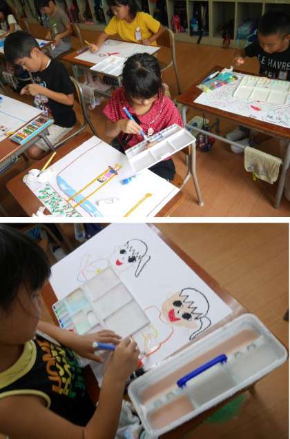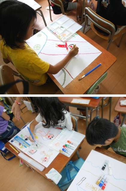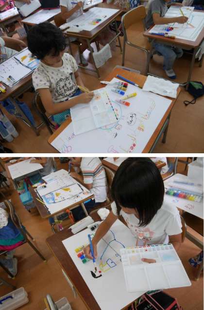 2年生では、水彩絵の具を使って色を塗っています。赤色と黄色と白色を上手にまぜてはだ色をつくっています。色づくりのしくみがわかってきたかな。クレパスではできなかったことが絵具ではできますね。いろんなはだ色が塗られていました。