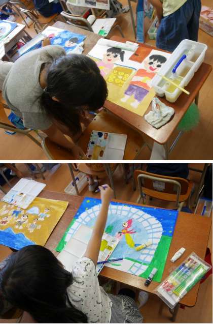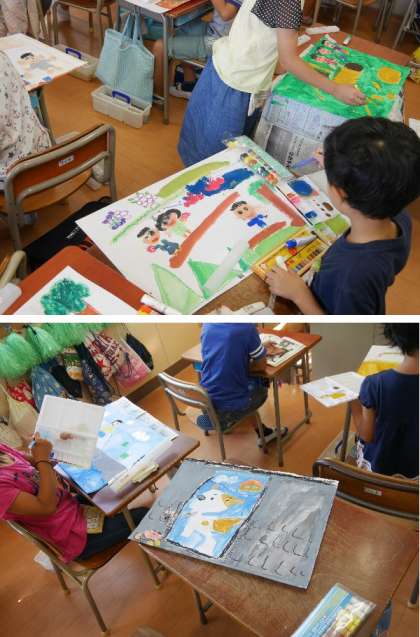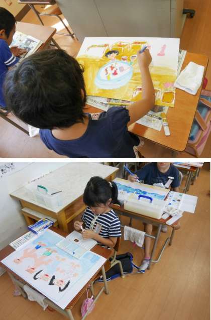 2年生が夏休みの思い出の絵を完成させていました。クレパスで描いて、背景を水彩絵の具で塗っていきます。楽しい思い出がそろいました。