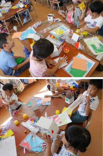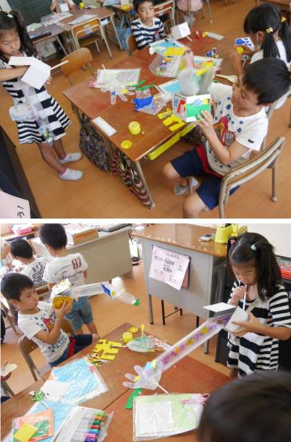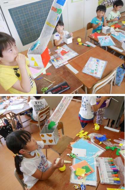 1年生の図工では、にょきにょきにょきと袋をストローで膨らますと箱の中からとびだしてきます。完成した人が膨らまして見せてくれました。