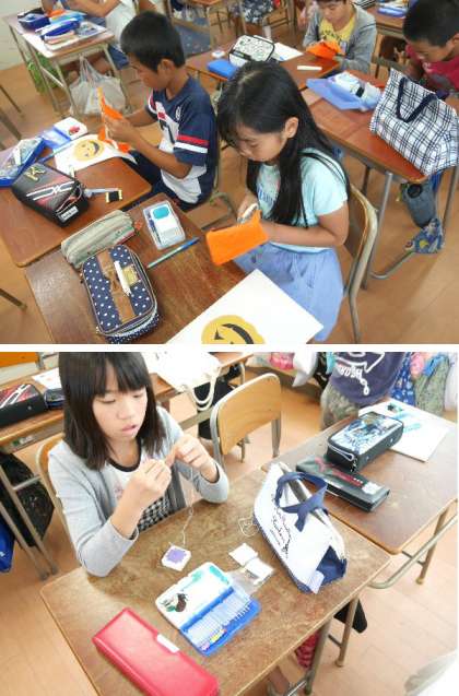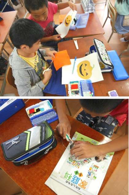 5年生の家庭科の授業で裁縫セットをだして、針に糸を通して玉どめしています。フエルトの生地をかぼちゃに切りとって作業をします。