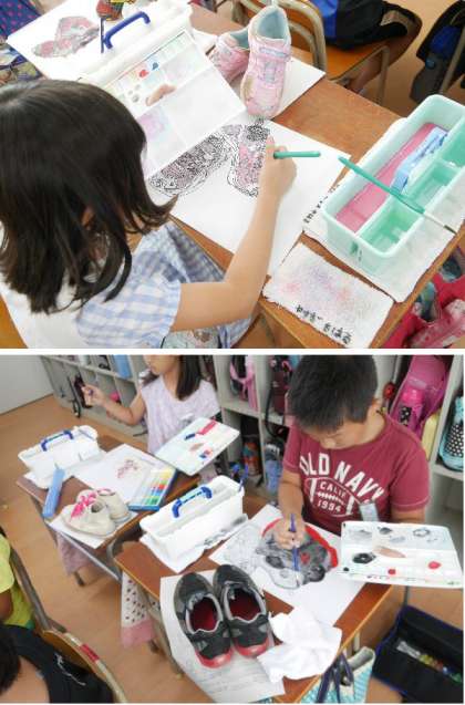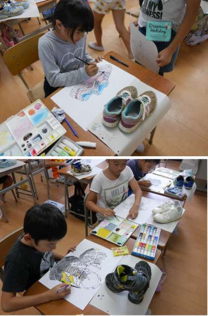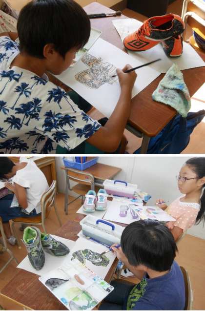 4年生が自分のはいてきた靴を机の上において絵を描いています。サインペンでしっかり輪郭を描き、水彩絵の具で本物と同じ色を作って塗っています。とてもリアルに仕上がっていますね。