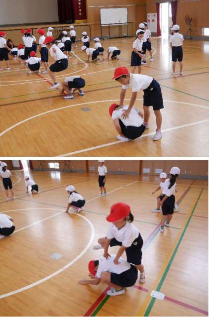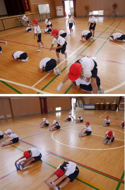 1年生が体育館で運動しています。ペアになって馬とびしたり、身体をまげたりとがんばっていました。