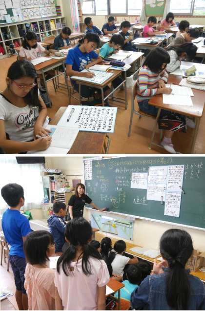 5年生の算数の授業です。2学級を3分割にして少人数授業をしています。分数の学習をしています。どちらが大きい数なのか?よく考えないとわからないですね。