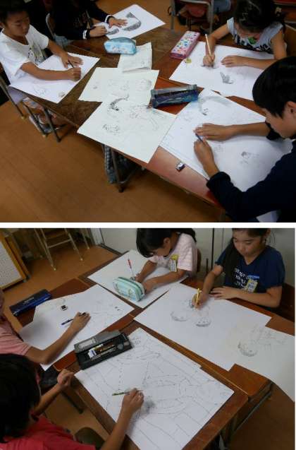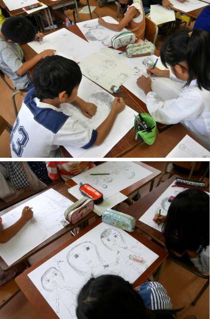 3年生が鉛筆で絵の下書きをしています。先生から顔をリアルに描きましょうと説明がありました。苦心しているところです。