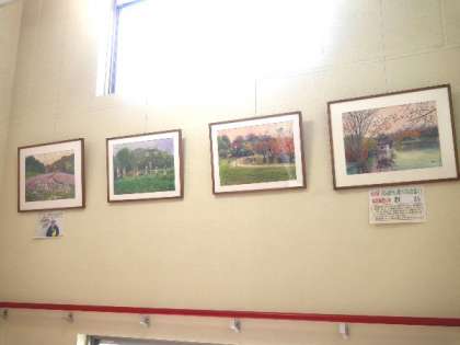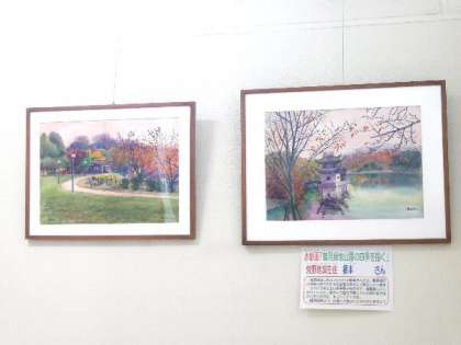 階段の踊り場に、焼野地域の榎本さんの水彩画を展示しています。鶴見緑地の秋らしい絵になりました。