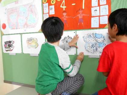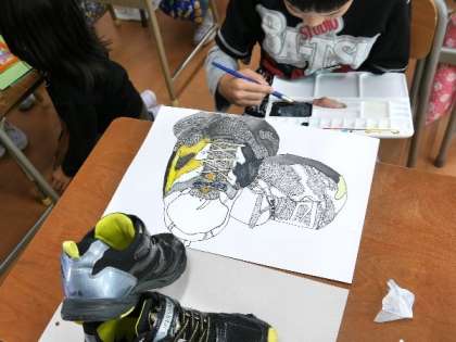 4年生の靴のリアルな絵ができあがり、自分たちで教室に展示していました。よくできていますね。