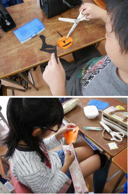 5年生の家庭科の授業で裁縫を学習しています。ボタンをつける学習です。いろんなハロウィーンのアップリケができてきました。楽しいですね。
