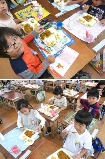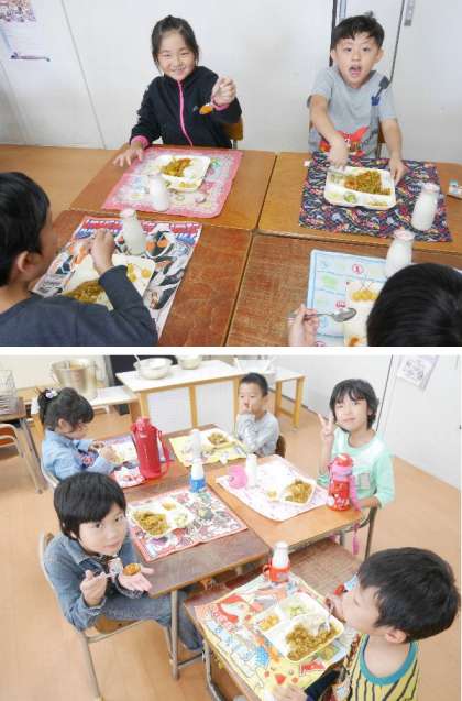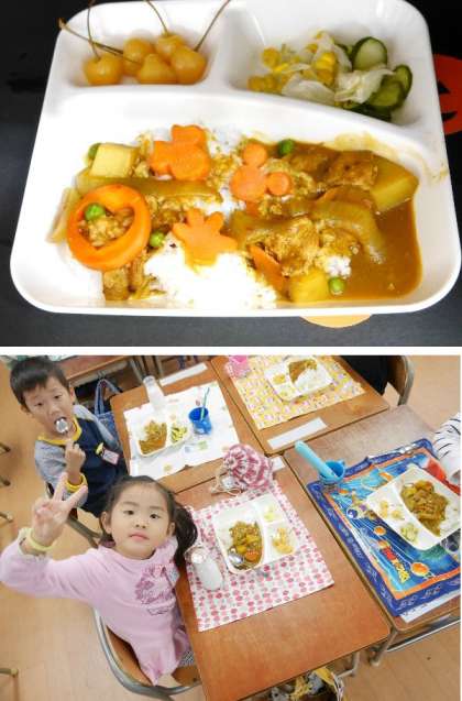今日の給食は皆の好きなカレーライスです。給食調理員さんが人参をミッキーやミニー、ハートに切り取って調理してくれていました。