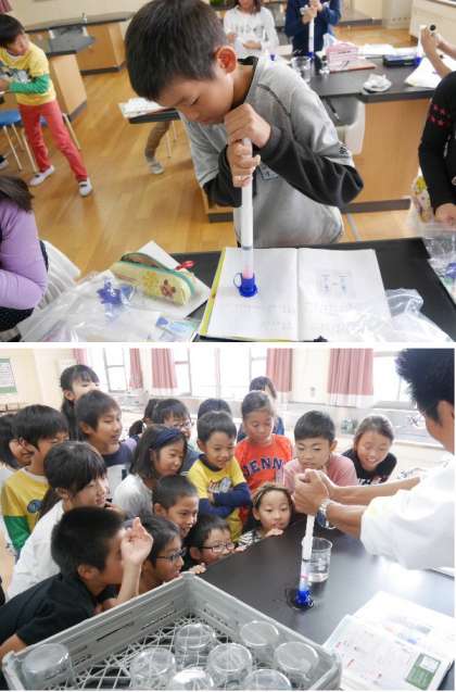 水てっぽうを使って、実際に空気を押し込めたらどうなるかを実験しました。中に入れたスポンジ人形が、小さくなってびっくりでした。興味深々で実験に取り組んでいました。
