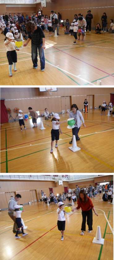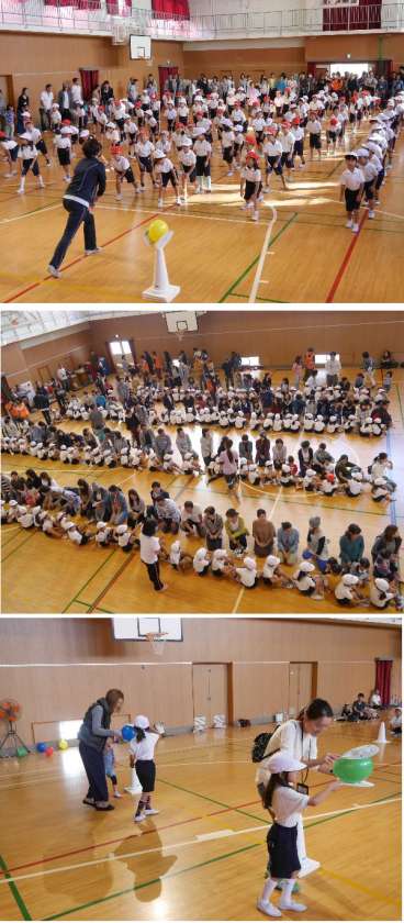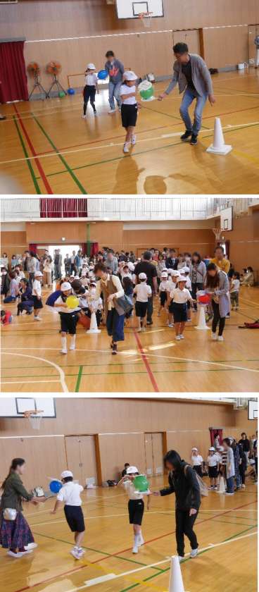 土曜授業でPTA集会がありました。1・2年生は「風船をうちわで運んでGO!」でした。準備体操のあと、保護者と子どもペアになってうちわで風船を運んでリレーしました。とても楽しくゲームできました。