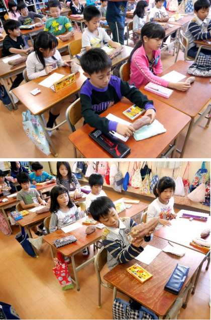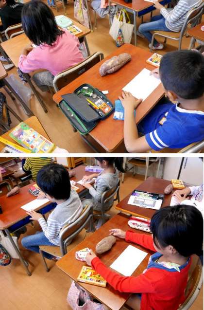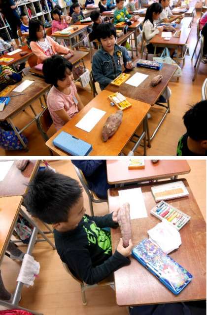 2年生が先日収穫したサツマイモを机の上に並べてじっくり観察しています。これからサツマイモの絵を描いていきます。
