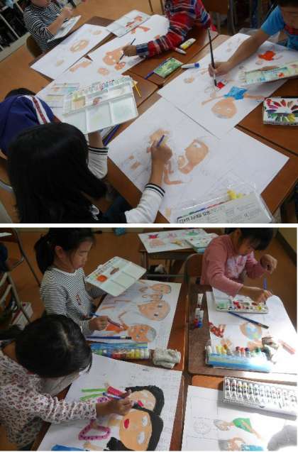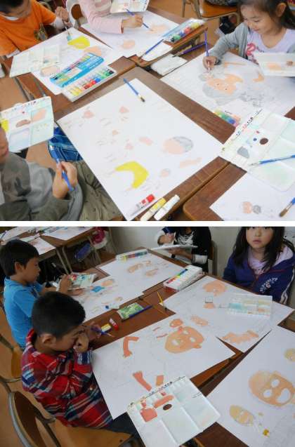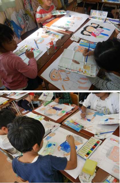 3年生が下書きした絵に色を塗っています。上手に絵具を混色しておもった色を作れるようになってきました。