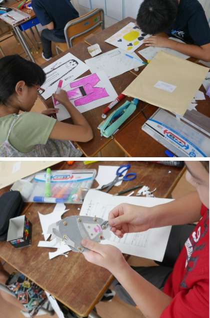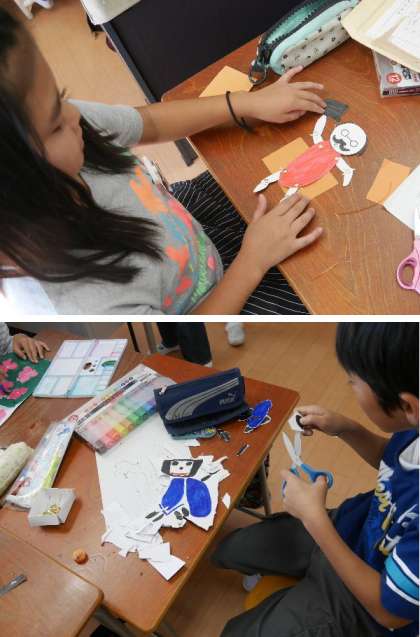 5年生が画用紙に色をぬり、切り取ってハトメでとめています。これは、少しずつ絵を動かしてカメラで写真をとってアニメを作るそうです。どんな作品ができるか楽しみですね。
