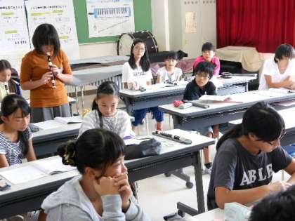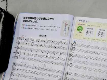 6年生の音楽で、和音の移り変わりを感じながら演奏していました。曲は「雨のうた」です。伴奏音楽にあわせてリコーダを演奏するテストをしていました。