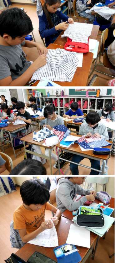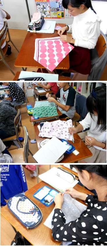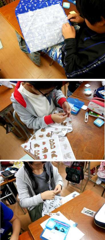 てぬぐい1枚を縫い合わせて手さげ袋をつくっています。昔の人の知恵ですね。切断せずに折ってあわせて縫うだけで完成です。お弁当いれなど便利に使えそうです。