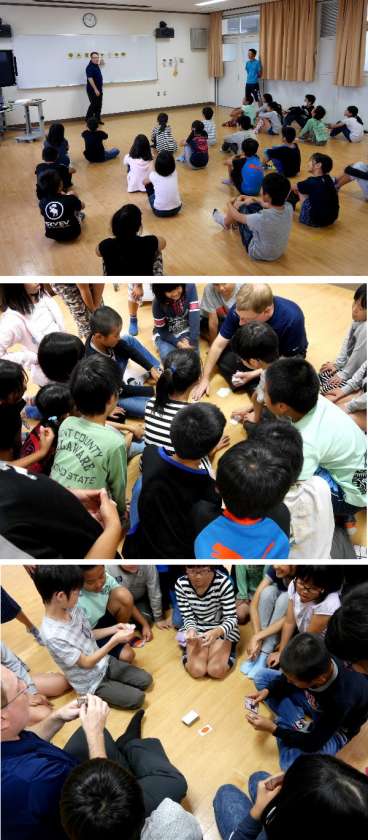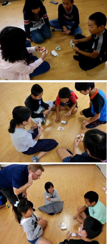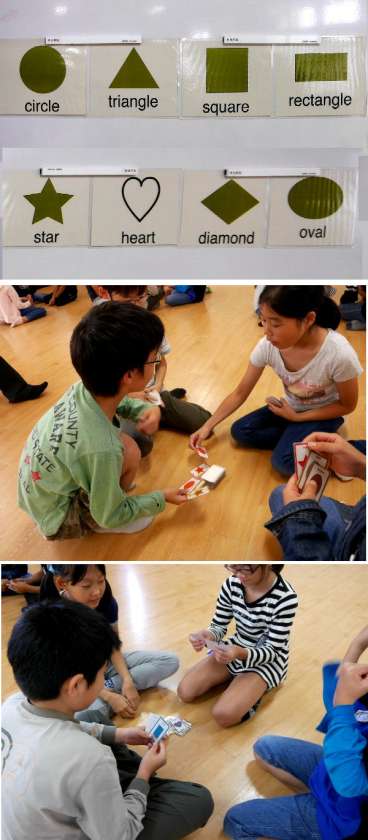 ネイティブ英語のスティーブ先生の授業です。いろいろな色と形が描かれたカードを使ってウノゲームをしました。ルールの説明を聞いてすぐにゲームです。単純なゲームだけど面白いですね。これなら自分たちでも作れそうです。