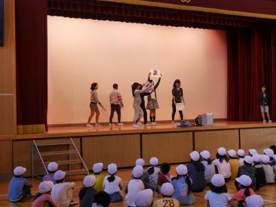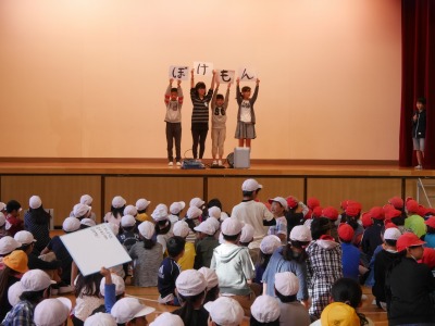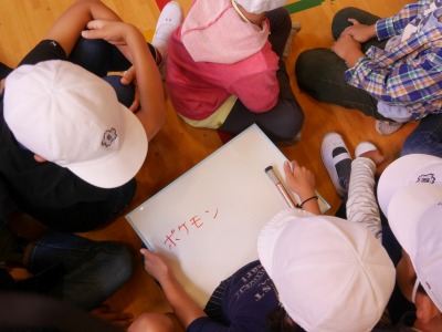 今日は、集会委員が考えたゲームをしました。数人の委員会の人が一文字ずつ書いた紙を手に持って、それを時々見せながら舞台の上を回ります。全員分を合わせると一つの言葉が出来上がり、その言葉を当てるというゲームです。たて割り班ごとに別れ、みんなで協力して一生懸命答えを考えていました。