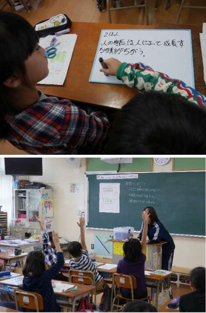 4年生で、保健室の先生が授業をしています。学年ごとの身長の伸びをテープを切ってはってみて比較しました。あまり4年ではのびてなかったですね。人によって1年で多く伸びた人もいますね。年齢とともに身長の伸びに何か関係はあるのかな?