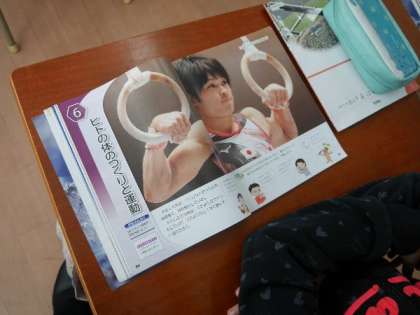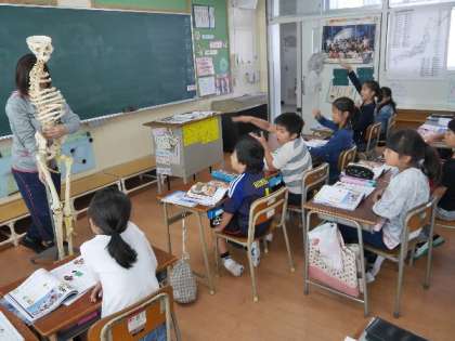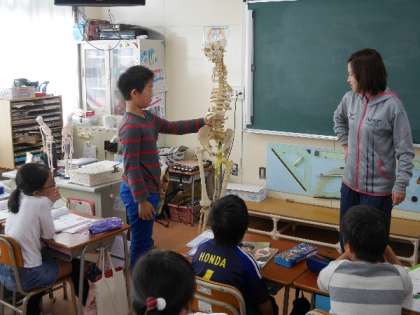 4年生の理科では、人の体のしくみについて学習しています。人体模型をみながら、体の曲げられるところを確認していました。