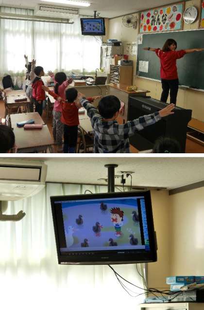 1年生がDVDを見ながら、歌っておどって数字を英語で発音しながら楽しそうに学習していました。これからは低学年から英語も少しずつ学習していく時代です。