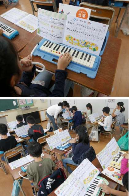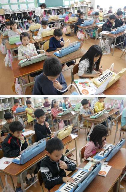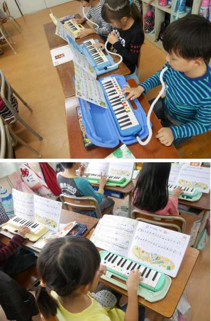 2年生が鍵盤ハーモニカで「よろこびのうた」を弾いていました。とても自信をもってしっかりと演奏できています。いい音が響いていましたよ。