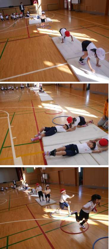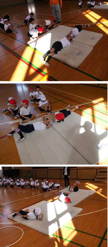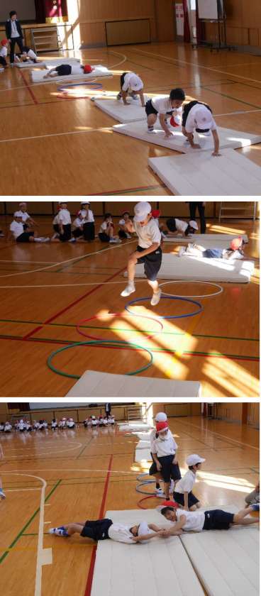 1年生が体育館で体育の授業をしています。マットで前まわりしたり、二人でころがったりとして楽しそうです。最後はマットのコースをいろいろな運動をしながら進みました。楽しみながら自然に運動ができました。