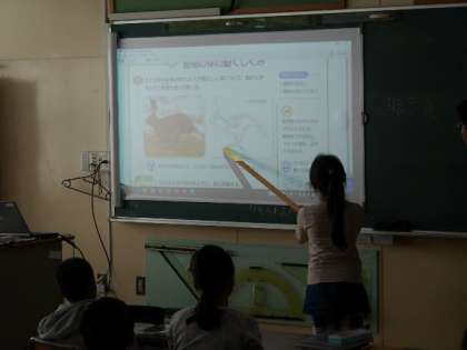 4年生の理科の授業です。動物の体のしくみについて学習しています。プロジェクタで教科書を映し出して皆で考えています。