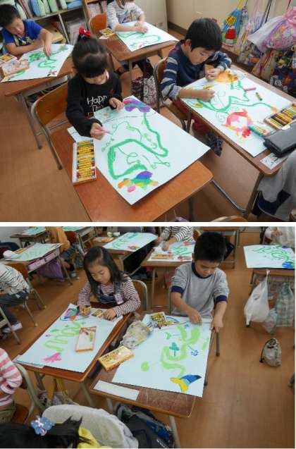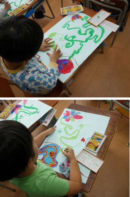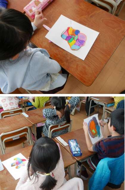 1年生の図工では、不思議な種をいろいろな色のクレパスを使って描いて切ってはりつけて、そこから緑色の芽を伸ばしていきます。とてもカラフルな絵ができそうです。