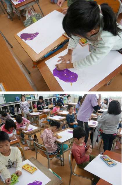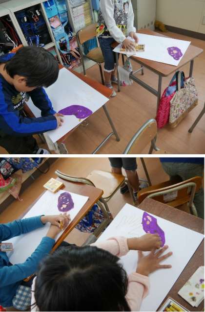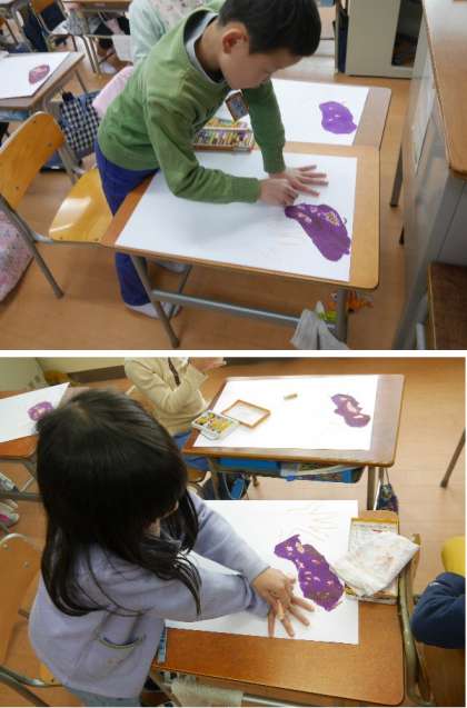 2年生の図工では、学習園で収穫したサツマイモの絵を描いています。そのサツマイモを収穫した手を描いているところです。手をあててかたどっています。リアルな絵ができあがりそうです。