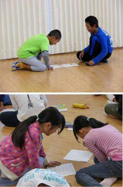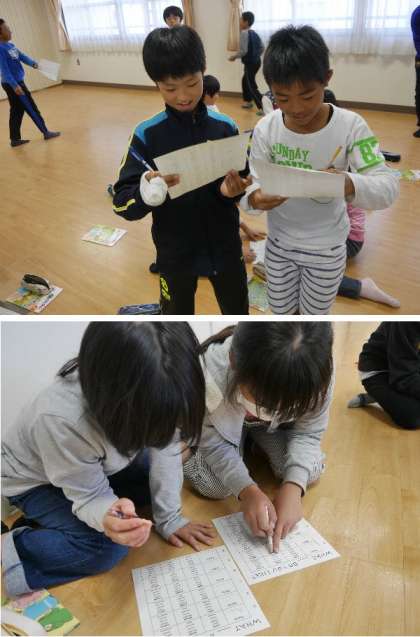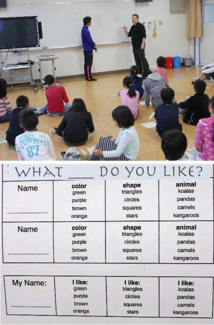 英語で好きなものを訪ねて、I like orange.と英語で答えます。楽しく会話しながらコミュニケーションをとっていきます。